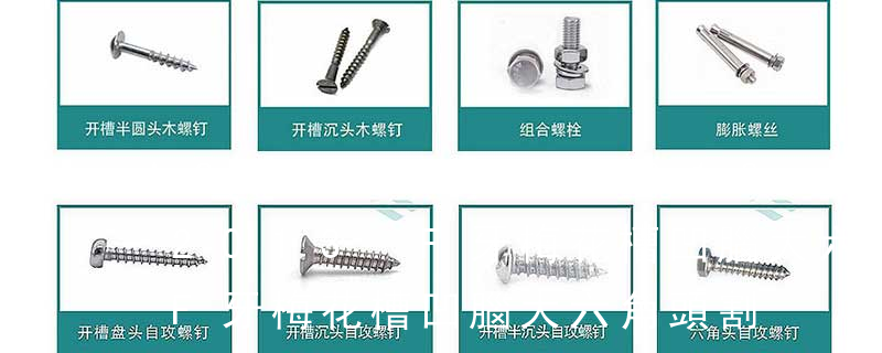 1.機螺釘 2.自攻螺釘 3.鉆尾螺釘 4.墻板釘 5.纖維板釘 6.木螺釘7.六角木螺釘 8.不脫出螺釘 9.組合螺釘 10.微型螺釘 11.家具螺釘 12.電子螺釘頭型:1.六角頭(hexagon head) 2.六角頭法蘭面(hexagon head with flange) 3.